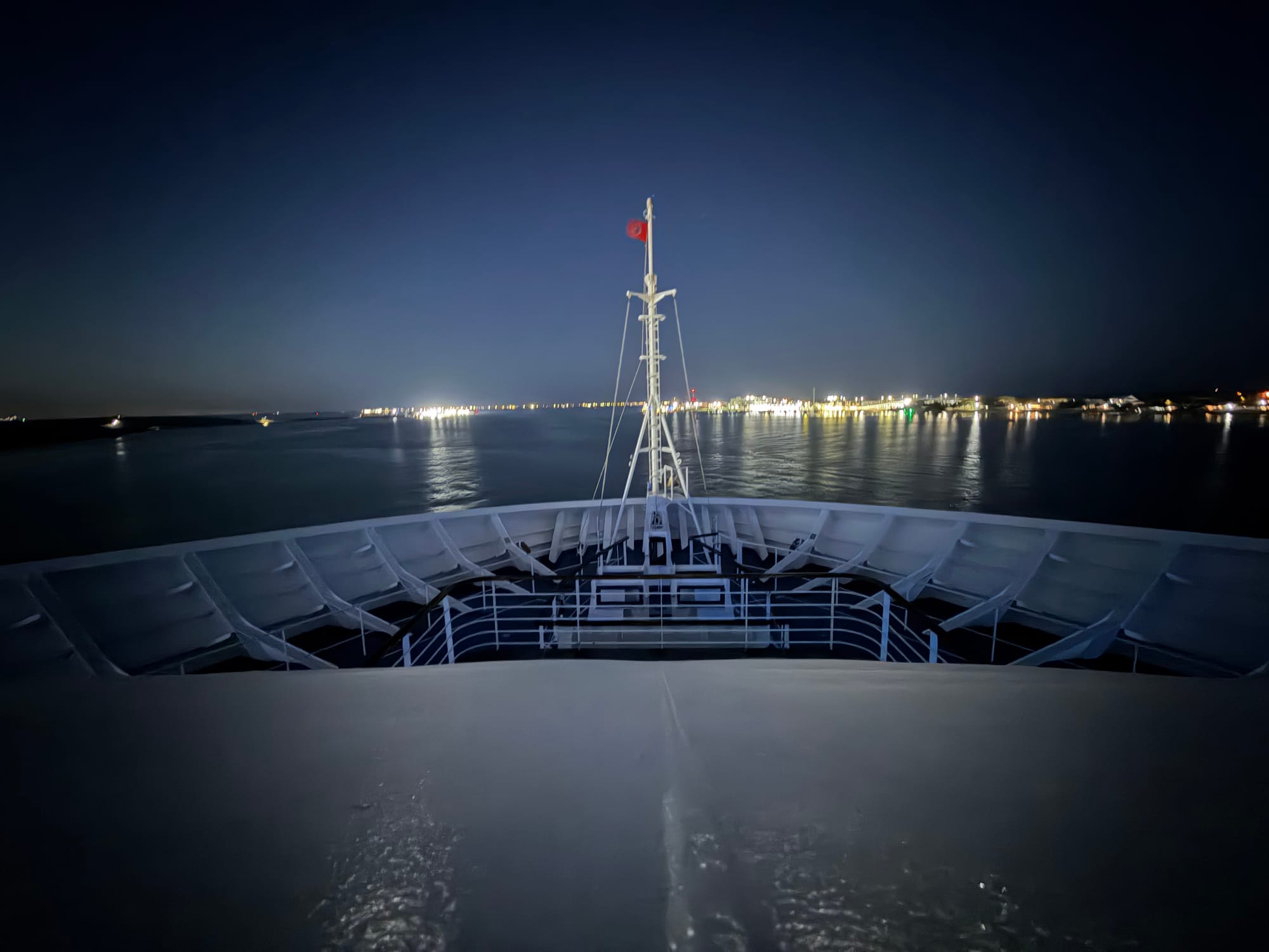 We are finally underway. Had to grab our jackets for the sail away. Just a little nippy.