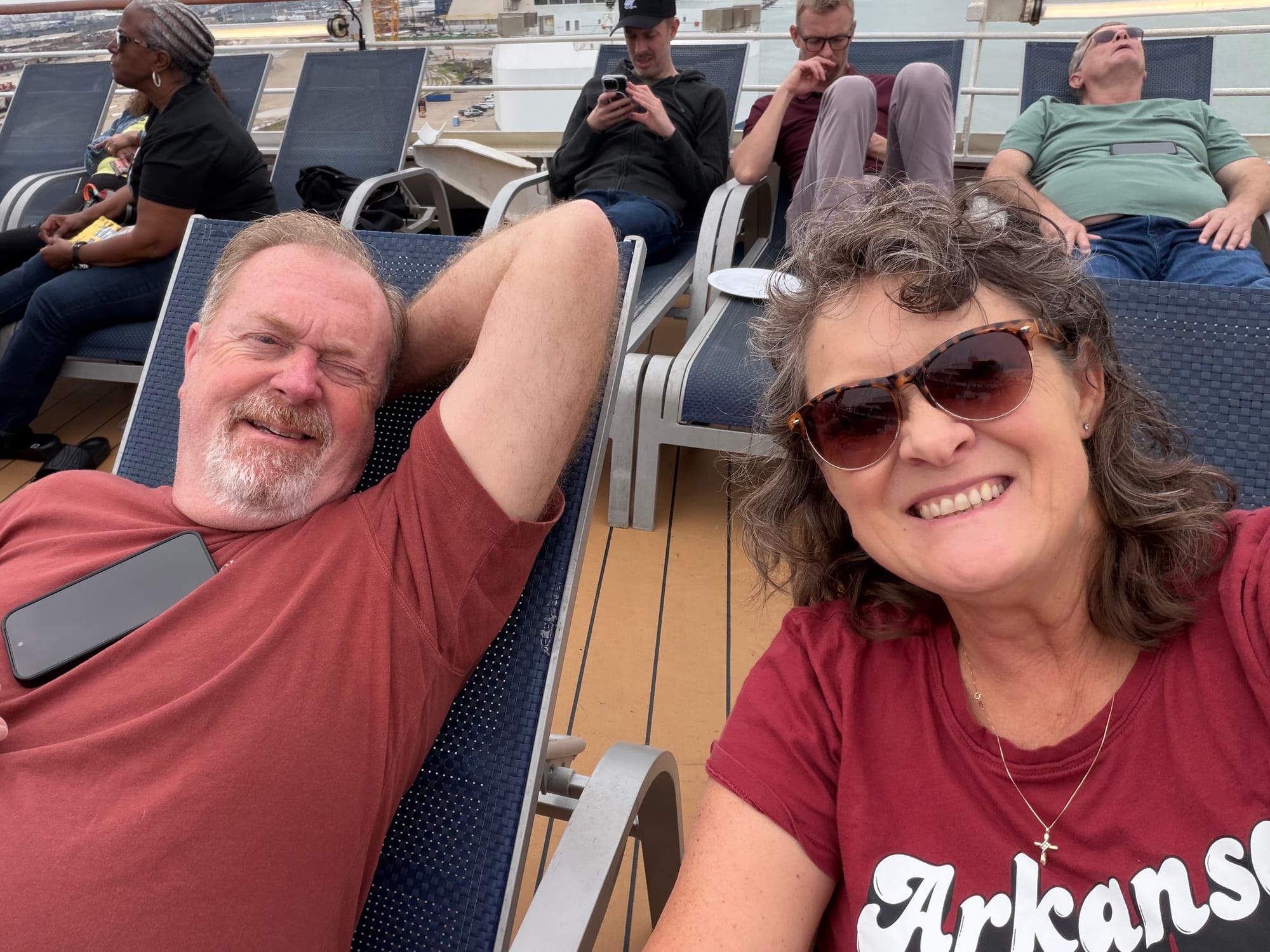 We have made it onboard the Carnival Dream. This is our transportation for the next 16 days. Kasey isn’t letting me ride the elevators. Gotta take the stairs even with our backpacks.