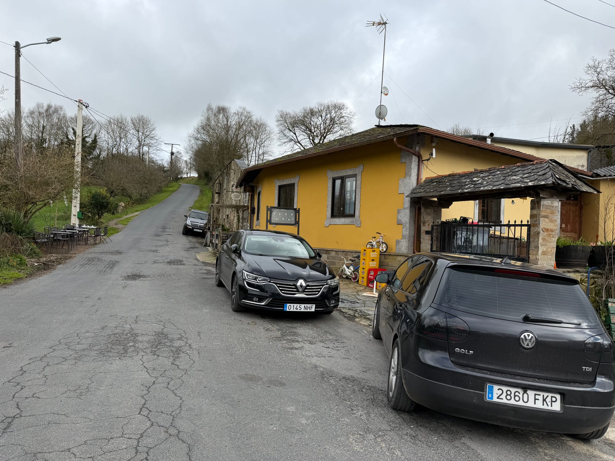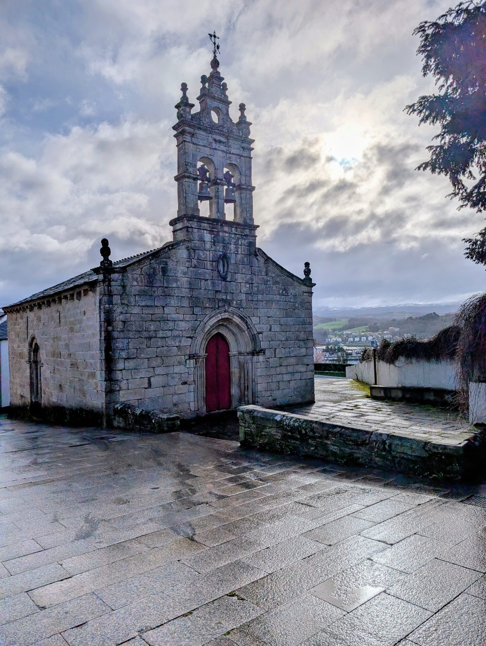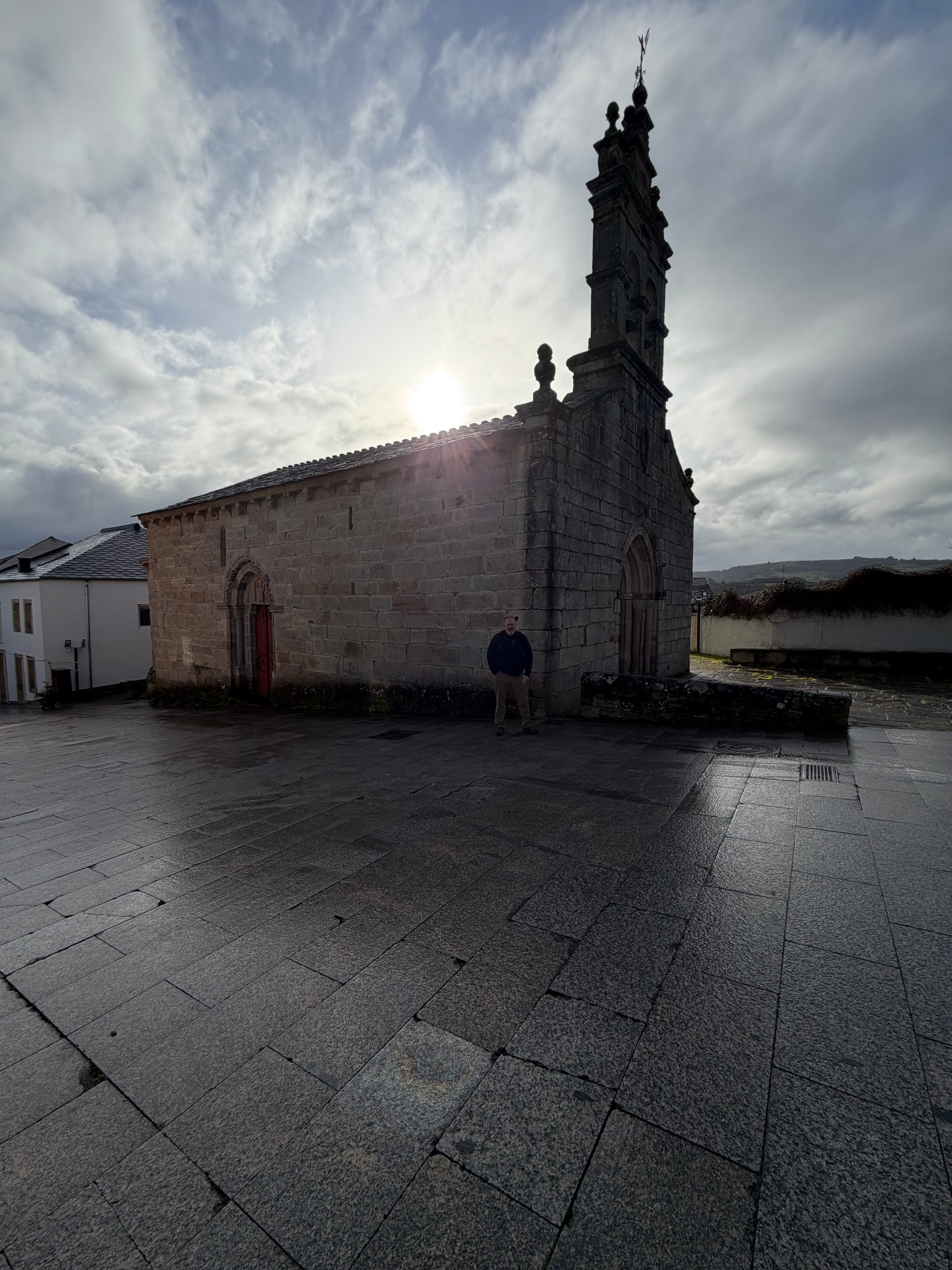 Sarria Pension, hill, churches, almost wrong way and cross.