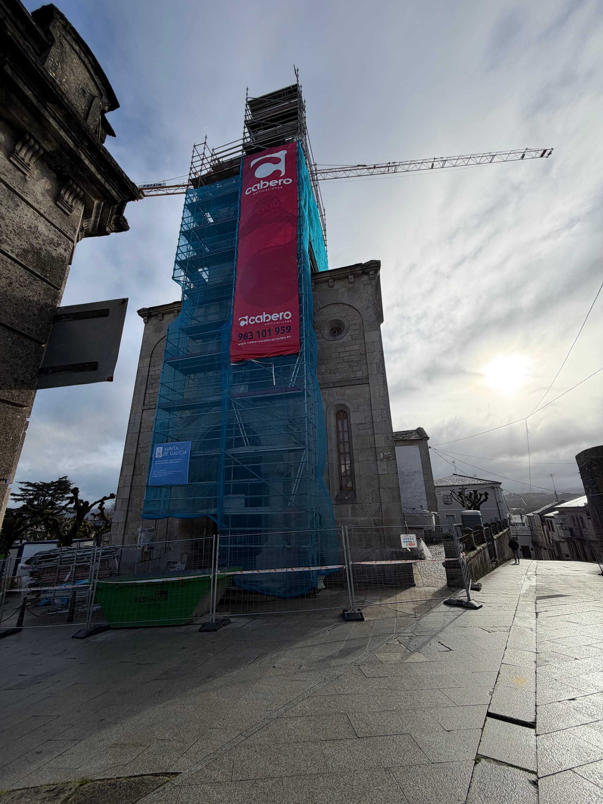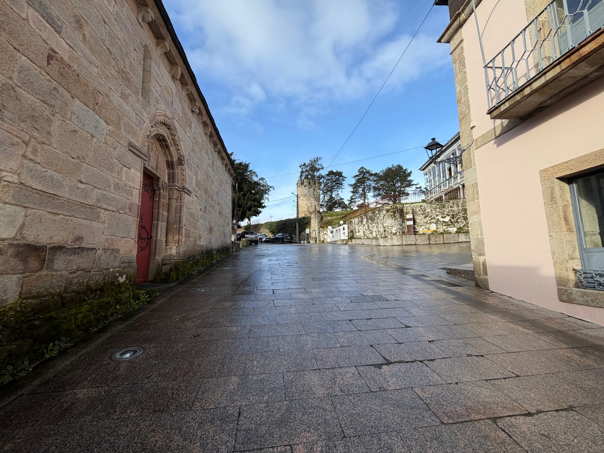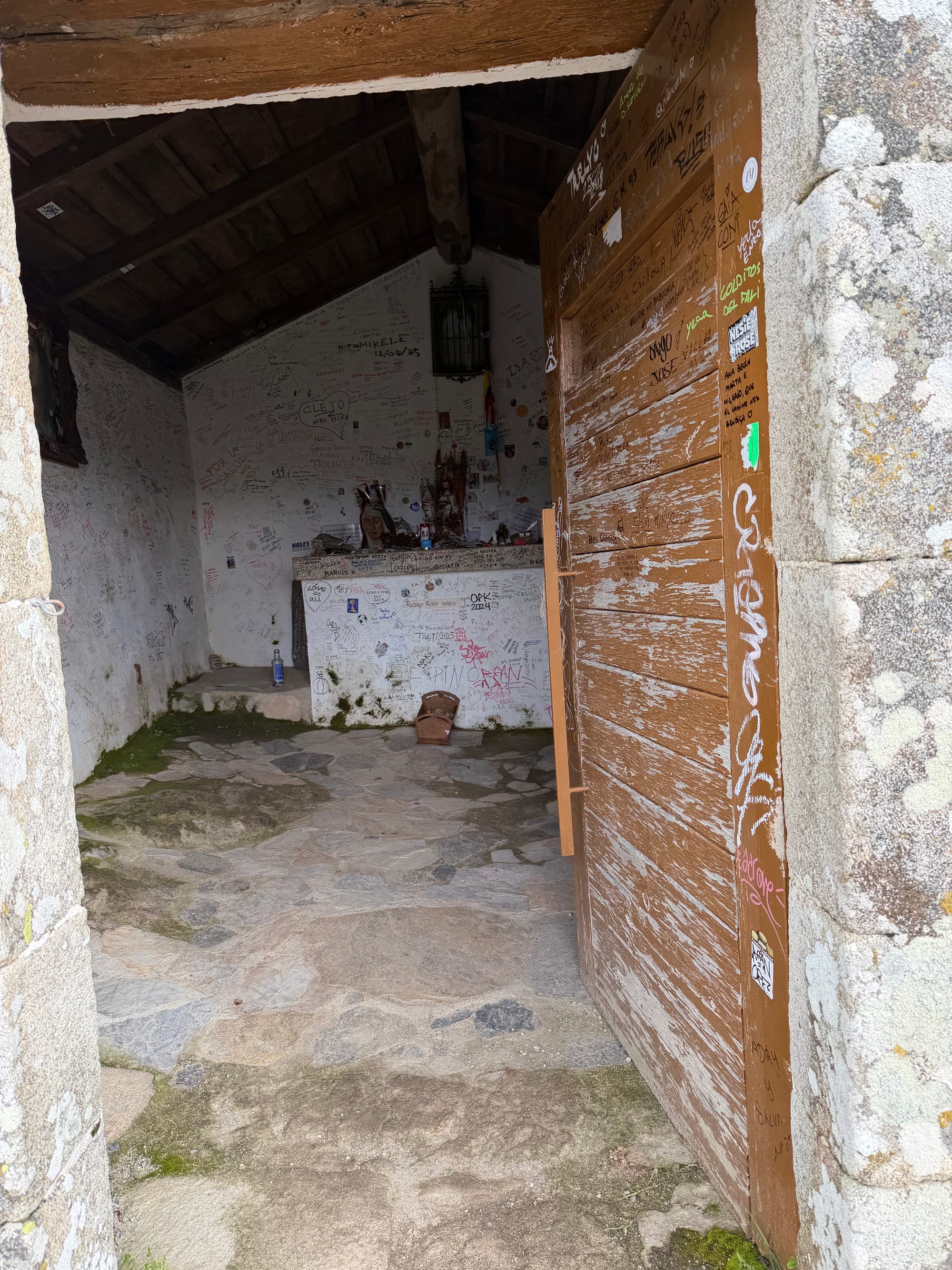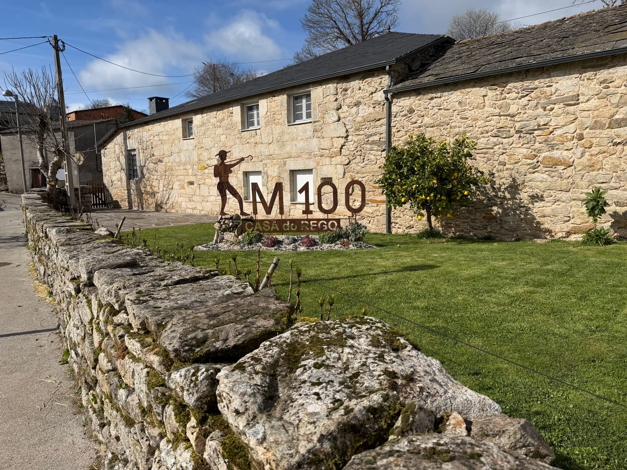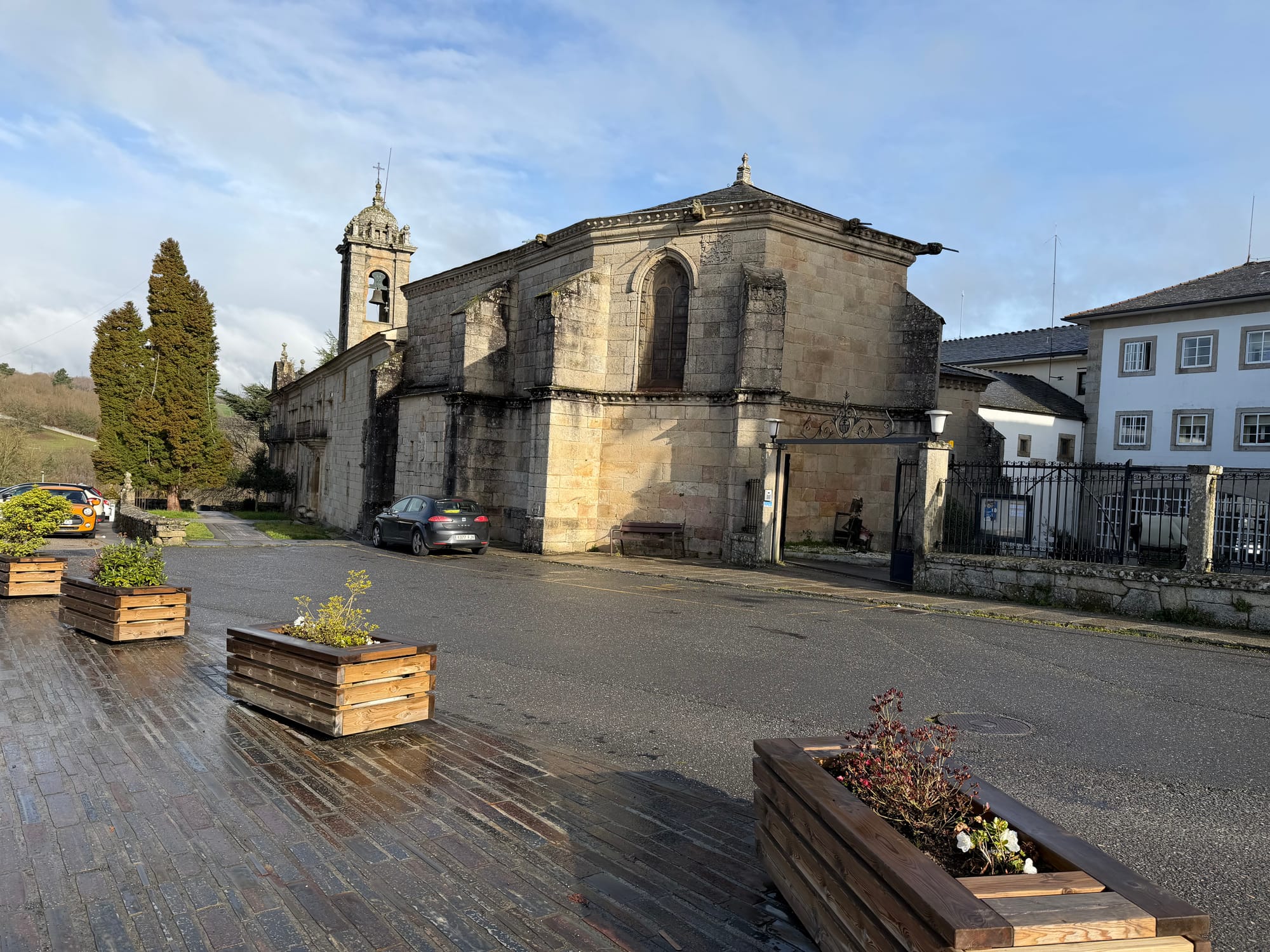 Church, dinner restaurant, 100 km to Santiago markers and sign.