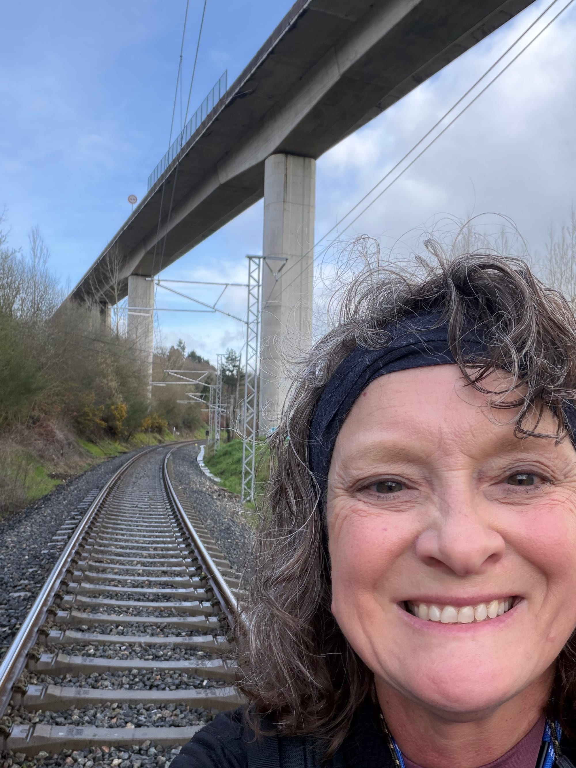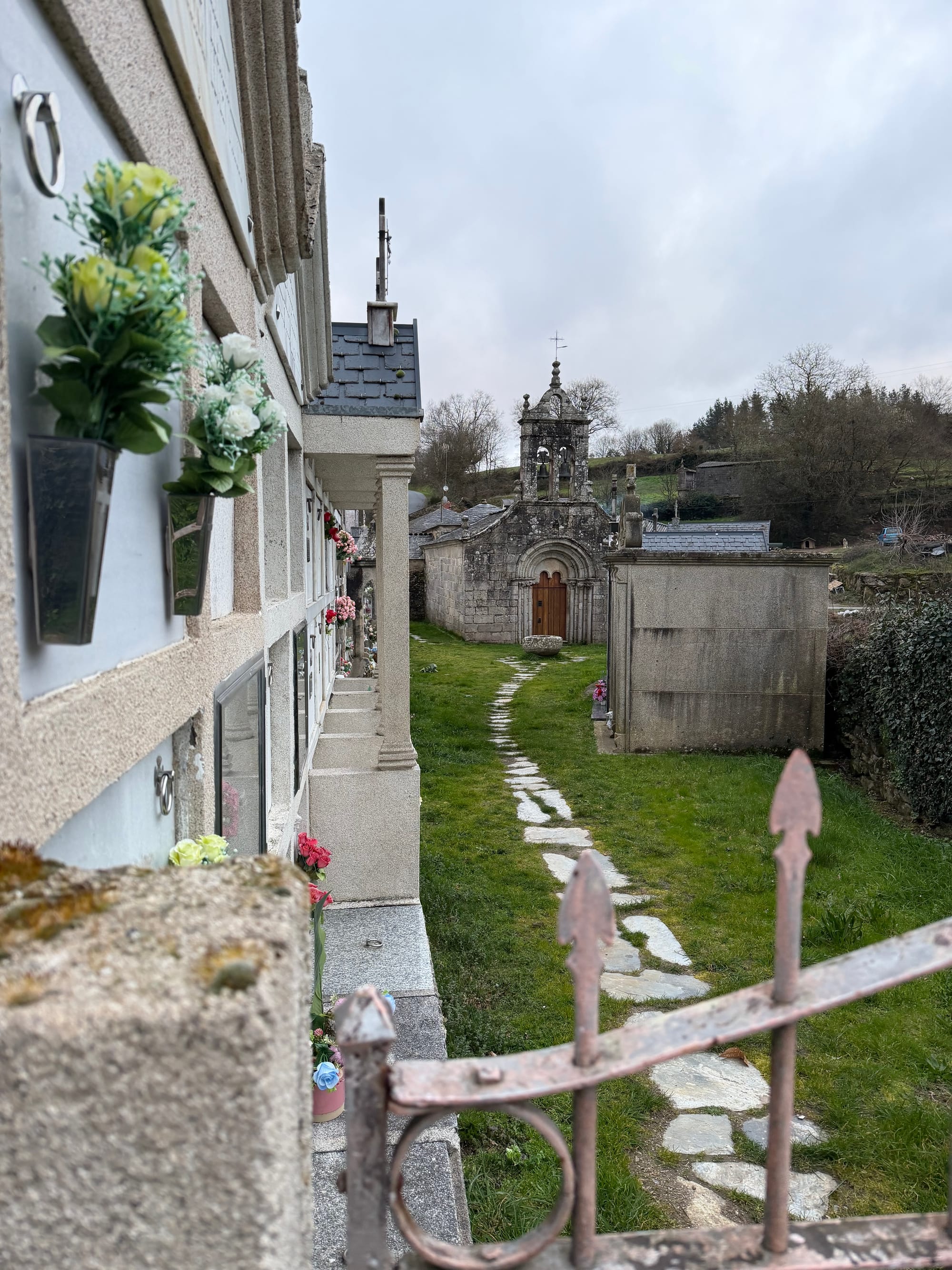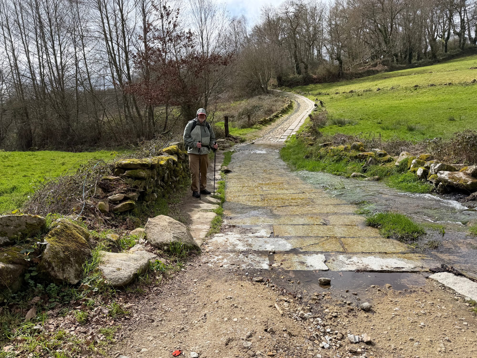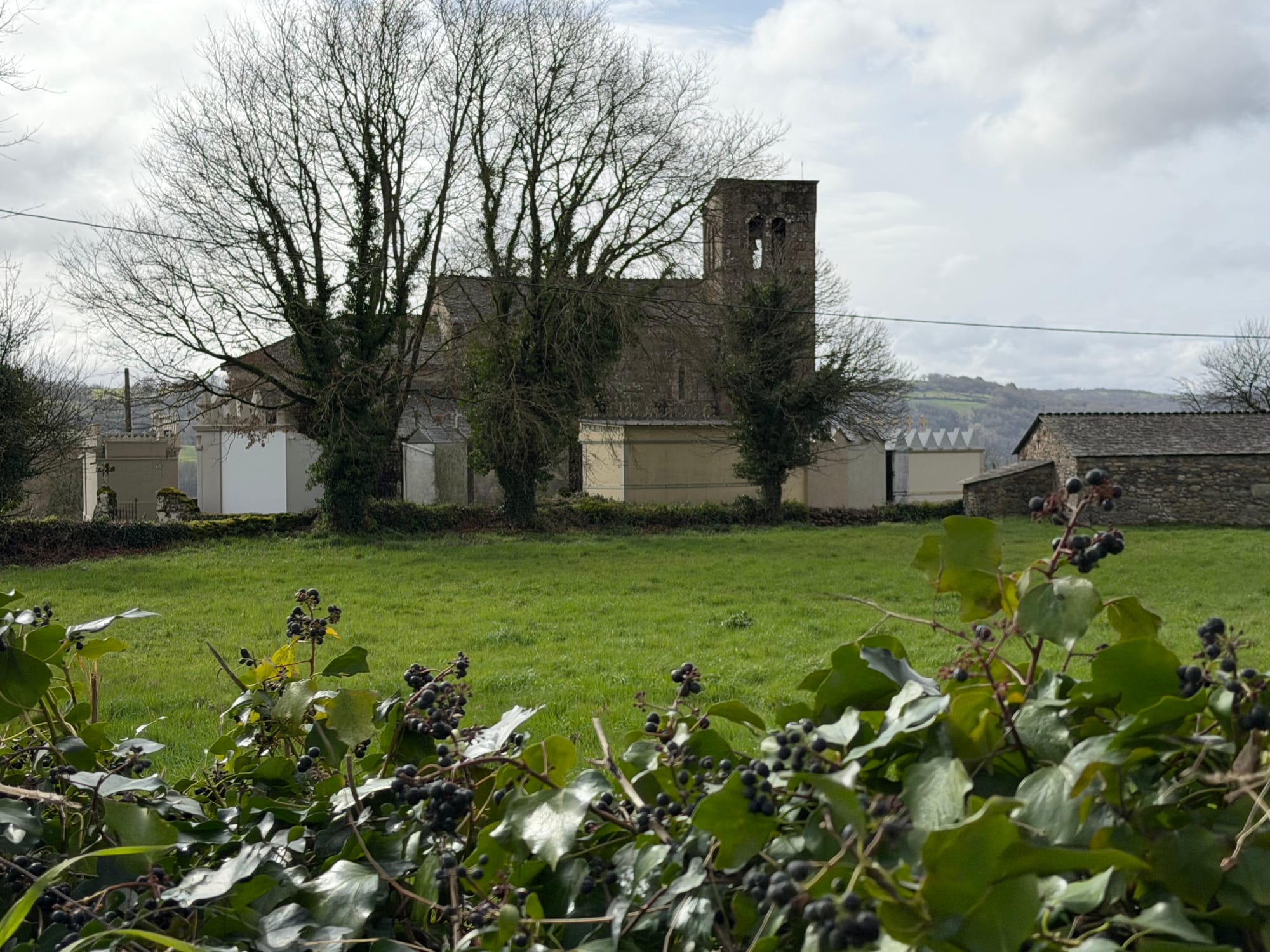 Church, cemetery, Roman bridge, choosing our route, railroad crossing, water crossing, gnarly tree and she’ll and open fields.