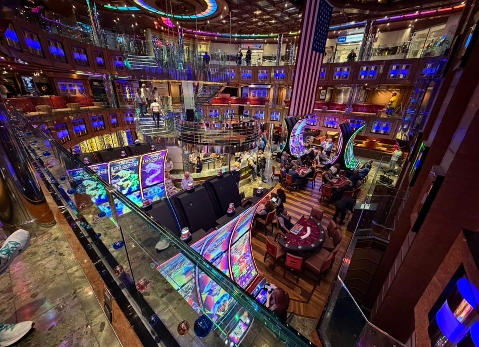 With no kids onboard, Casino’s Slot Machines are set up in the atrium.